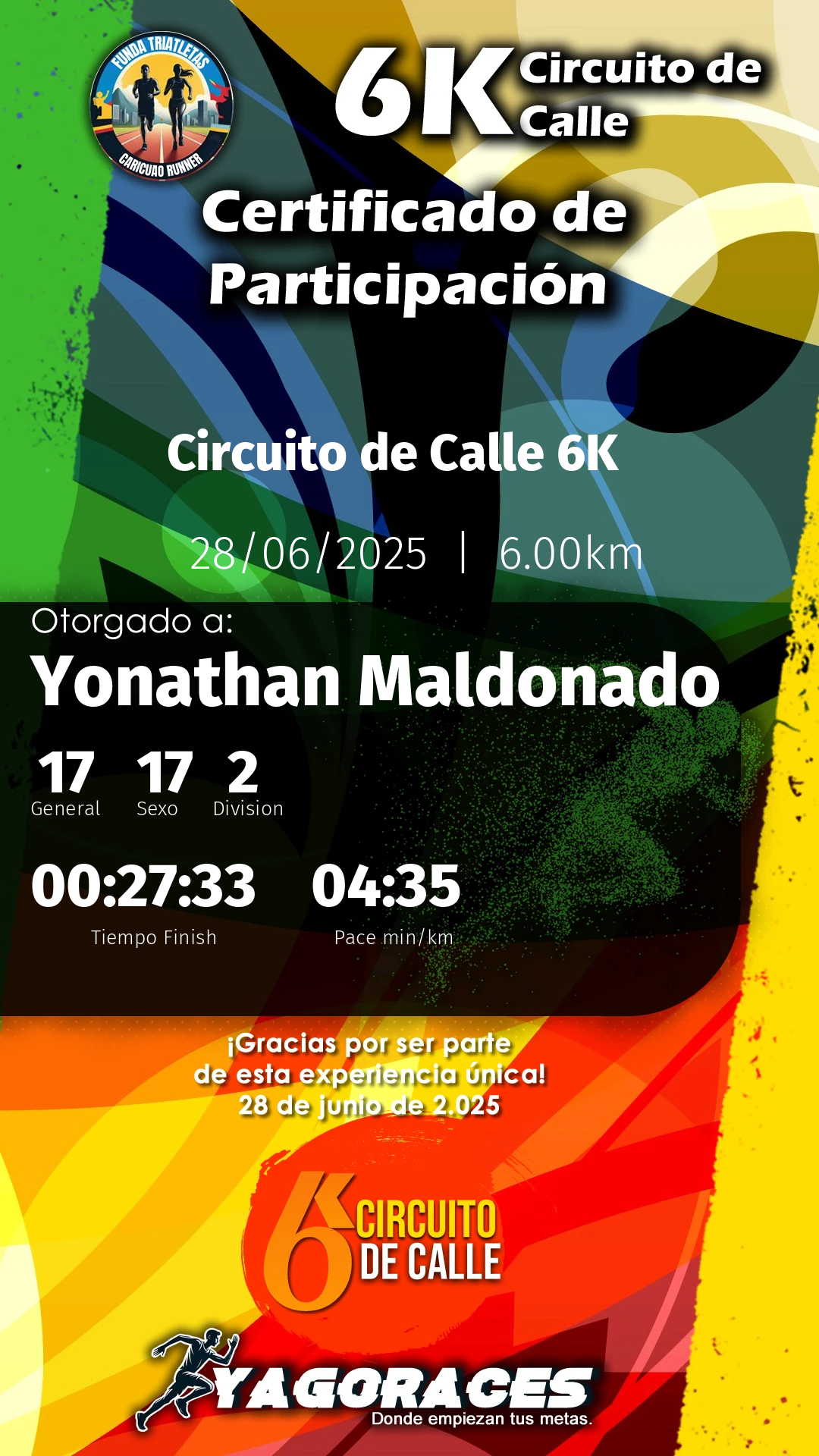 Tu esfuerzo, dedicación y espíritu son lo que hace cada evento único y memorable. Nos llena de orgullo contar con atletas como tú, que inspiran con cada paso. Esperamos que hayas disfrutado tanto como nosotros organizando este encuentro.