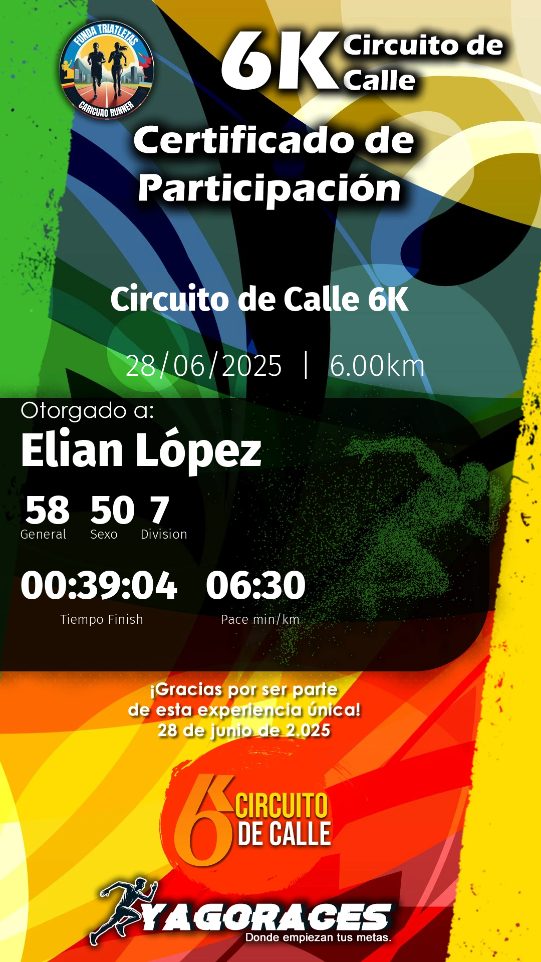 Tu esfuerzo, dedicación y espíritu son lo que hace cada evento único y memorable. Nos llena de orgullo contar con atletas como tú, que inspiran con cada paso. Esperamos que hayas disfrutado tanto como nosotros organizando este encuentro.